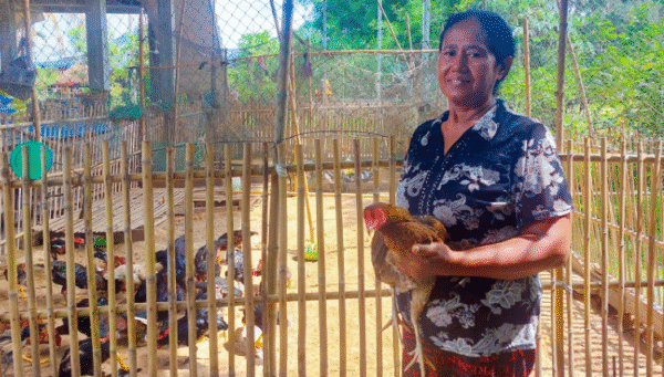 Raising chickens has brought extra income to Davy’s family. She moved from traditional to more sustainable farming, giving her chickens medicine, and growing extra crops for feed. These changes have helped her support her children’s education, buy fertilizer, repay loans, and save money.