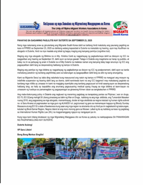 Nang mga nakaraang araw ay ginulantang ang Migrante South Korea dahil sa balitang hindi matutuloy ang paunang pagdinig sa kaso ni FPRRD sa September 23, 2025 sa dahilang walang kapasidad si Duterte na makadalo ng hearing, ayon kay Kauffman na abogado ni Duterte, hindi na niya maalala ang lahat ng bagay maging ang kanyang pamilya (cognitive lost).